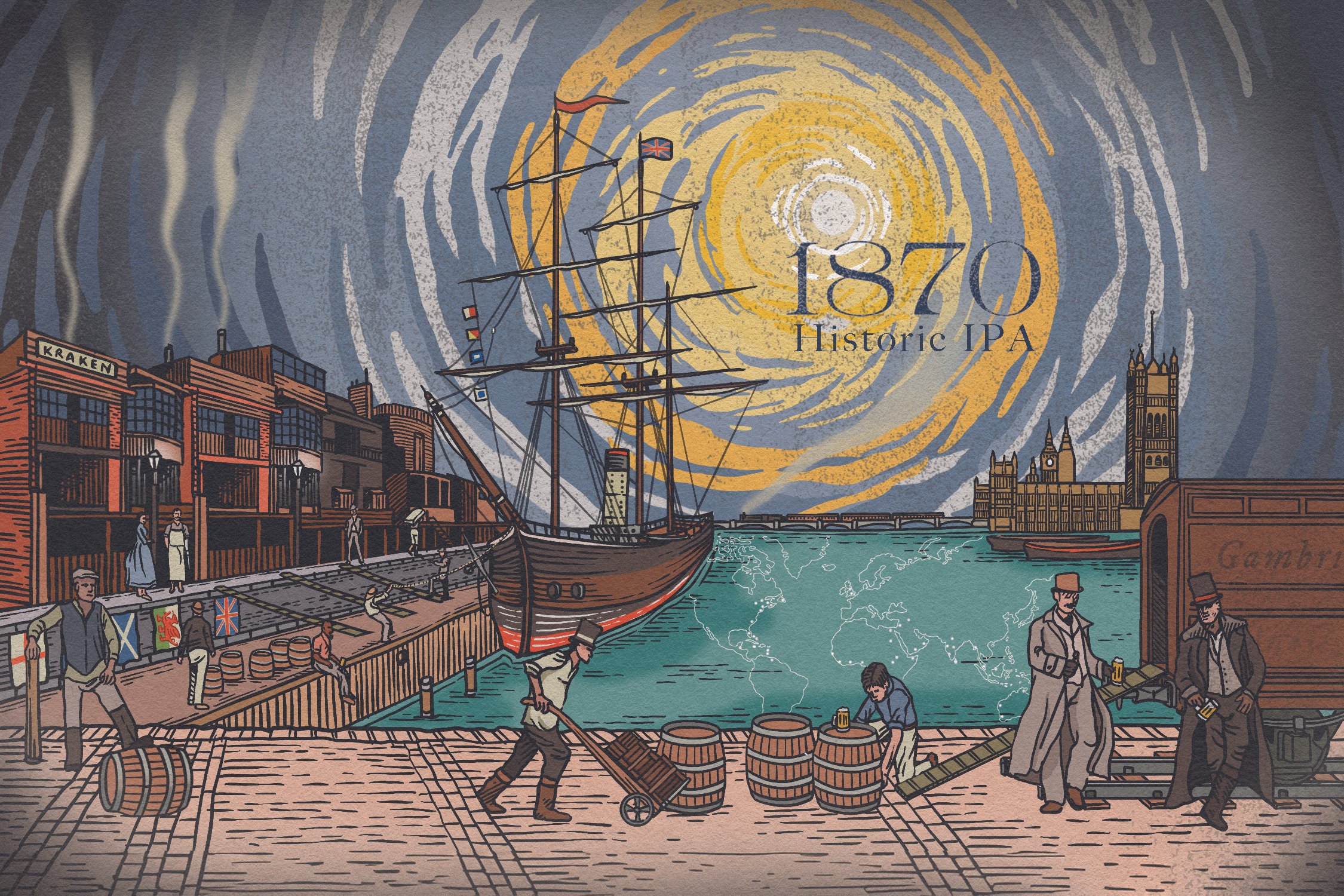 The original IPAs were hopped with 100% Goldings hops, mostly from East Kent. But by the 1870s another variety, Strisselspalt, was being used along with Goldings. Our 1870 IPA is a replica of a domestic IPA, one that never made the four month long trip to India. The heat on that journey activated a then-unknown wild yeast, almost certainly Brettanomyces claussenii, givin the export IPAs a funky, stock ale flavour. 1870 is the clean domestic version since the Brett would not have had a chance to re-ferment the beer in the short time window and colder weather of the UK it faced before making it to the taps.